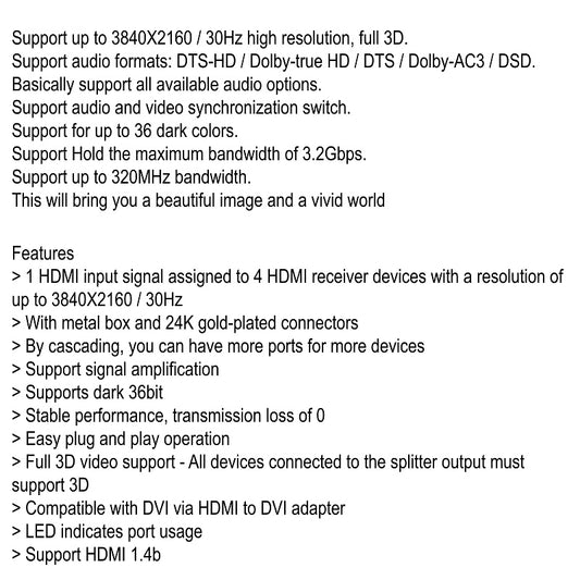4K 1x4 HDMI Splitter/Distributor 1 Input 4 Output | HM104