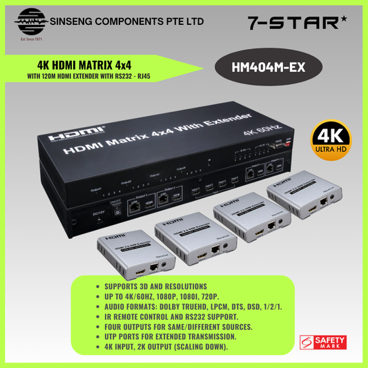 4K 60Hz 4x4 HDMI Matrix with 120M Extender & RS232 over RJ45 | HM404M-EX