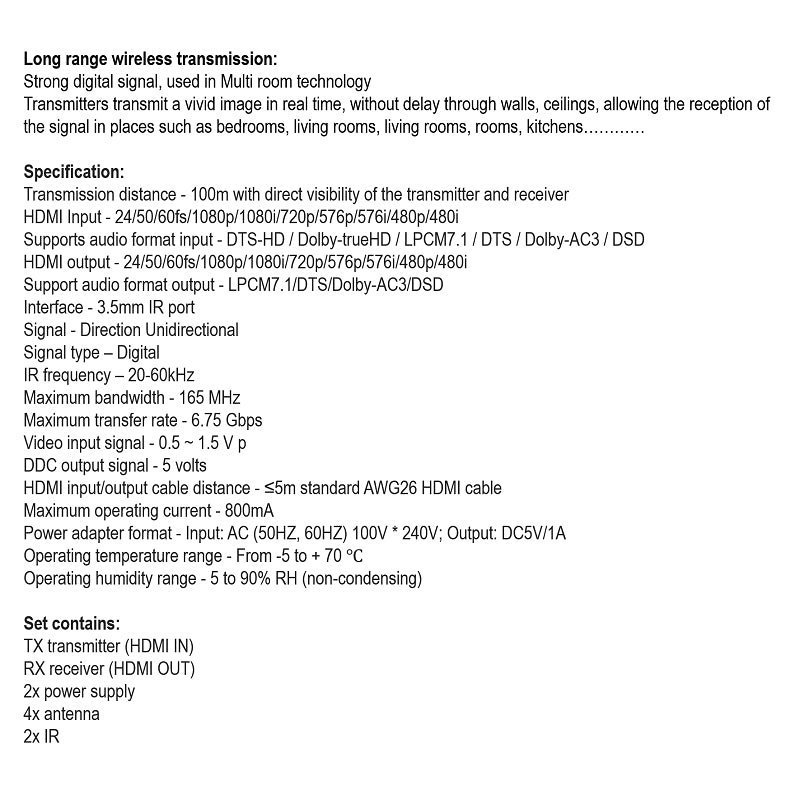 Wireless HDMI Signal Transmission: Transmits HDMI signals via a built-in wireless transmission protocol, supporting up to 100 meters in a barrier-free space with a 1 TX to 1 RX mode.