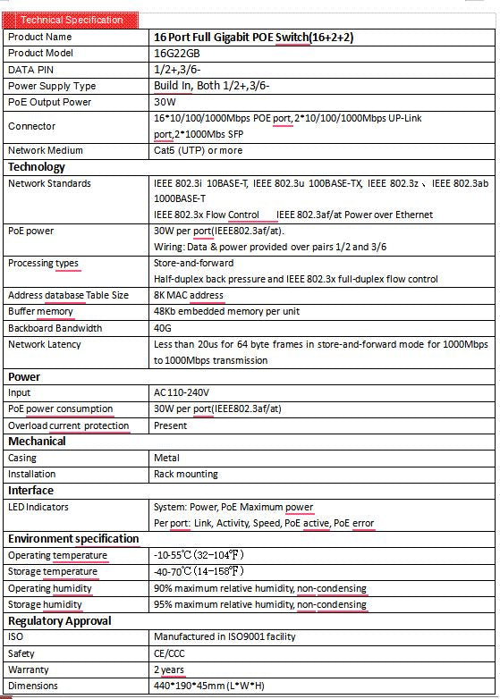 16 × Gigabit PoE ports, 30W max per port