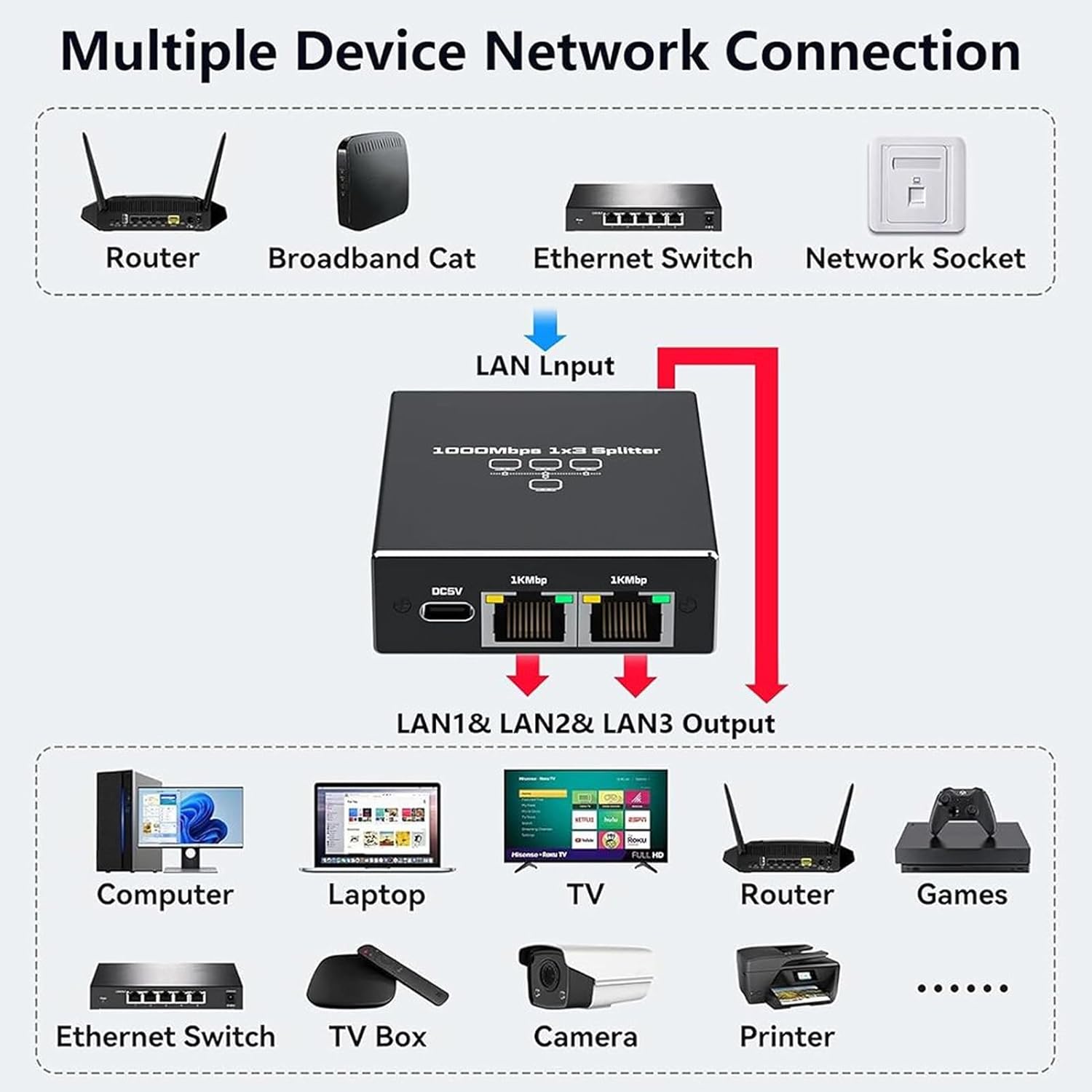 1 to 3 Ethernet Splitter – Share 1 LAN cable with up to 3 devices