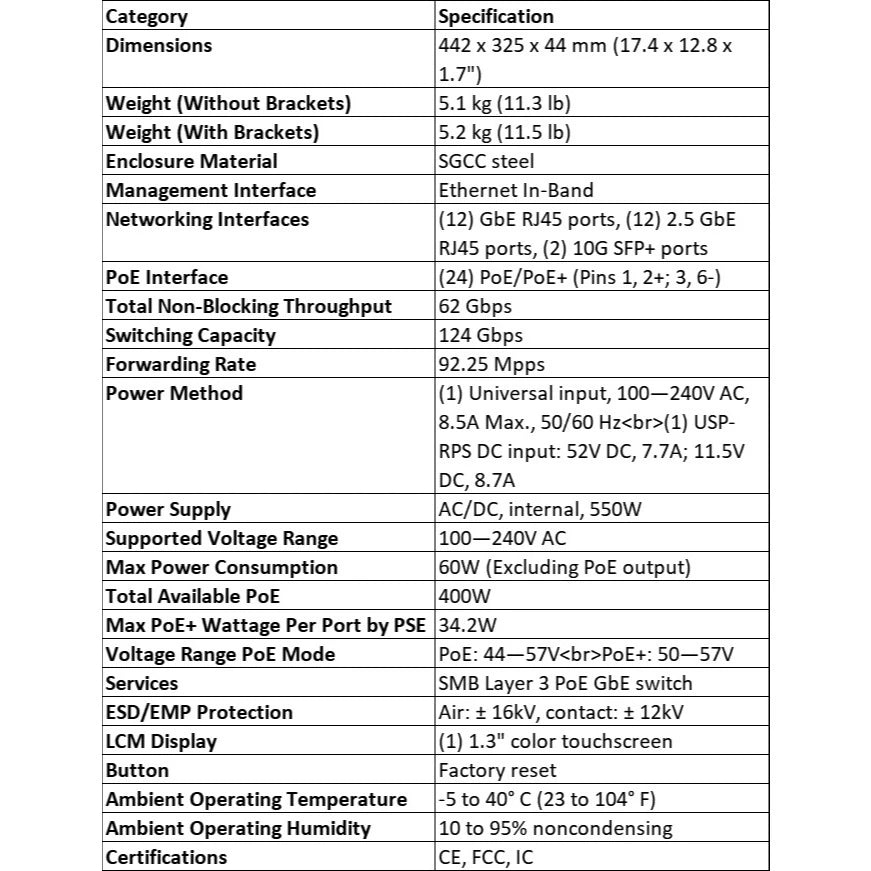 (12) 2.5GbE, 802.3at PoE+ RJ45 ports
