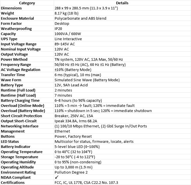 - 1,000VA / 600W line-interactive UPS with 108Wh hot-swappable battery