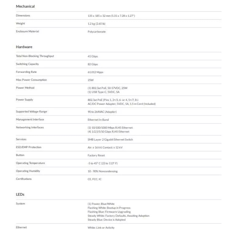 A compact, 5-port, Layer 2 switch that supports 10 GbE speeds and can be powered with PoE or a 5V USB-C adapter.